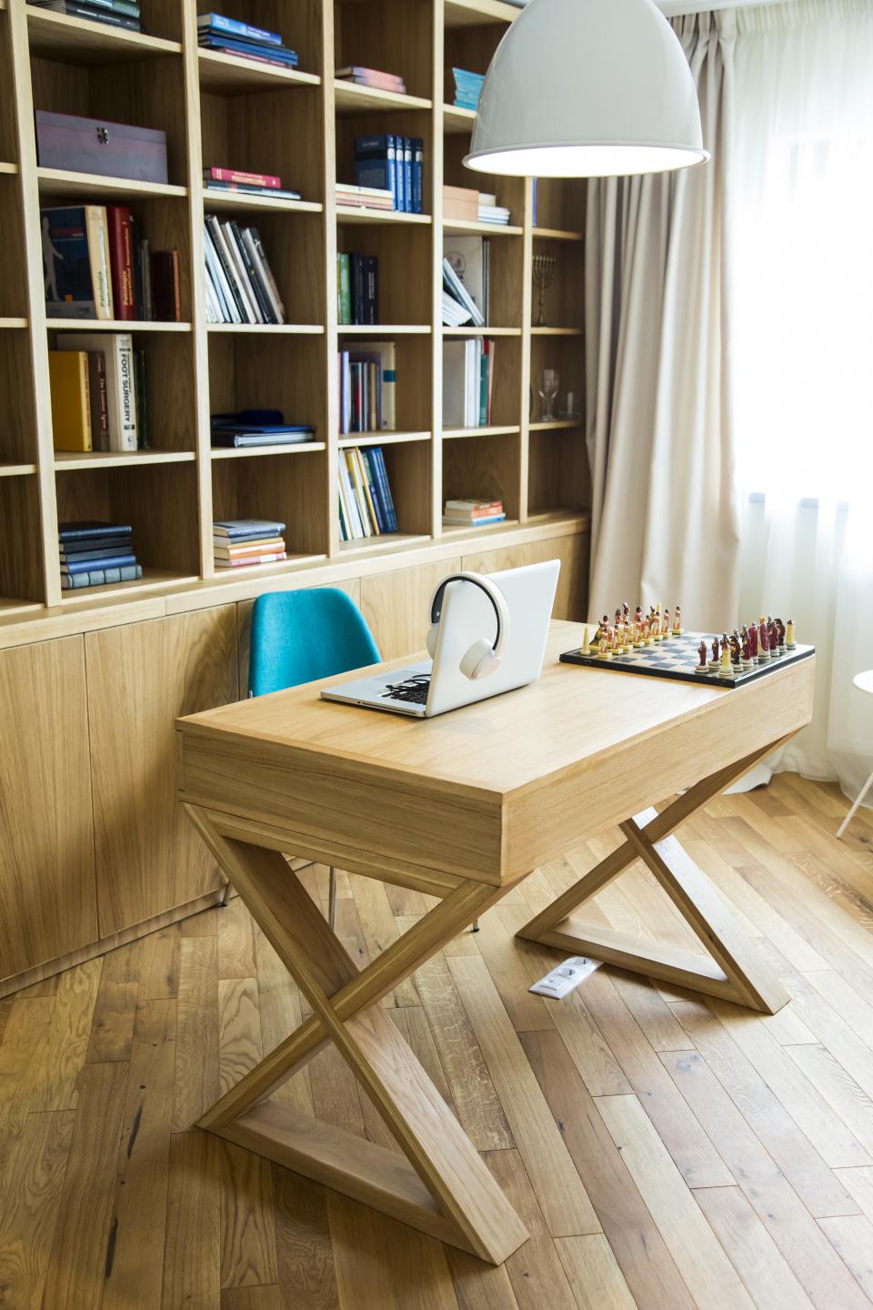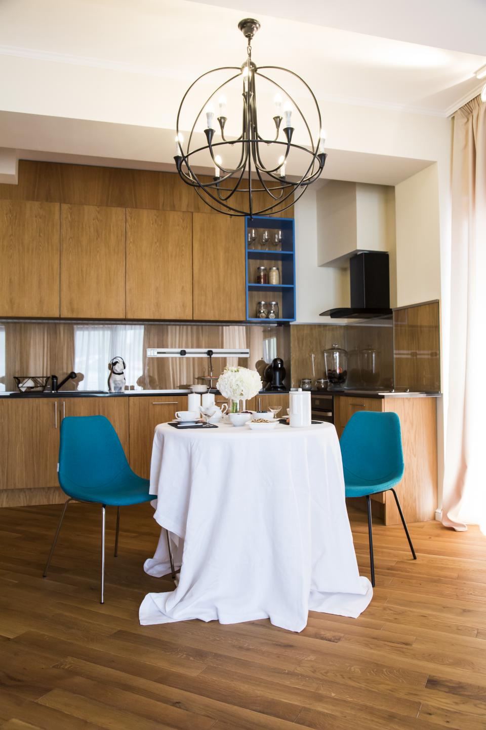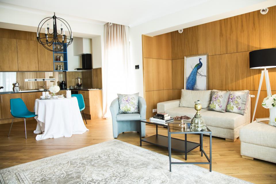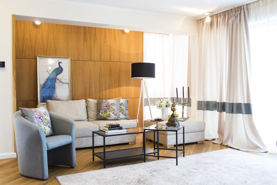 În imagini se poate observa interiorul unei locuințe în care s-a realizat un mix reușit între parchetul rustic, mobila de lemn și elementele, respectiv culorile moderne de decor.
